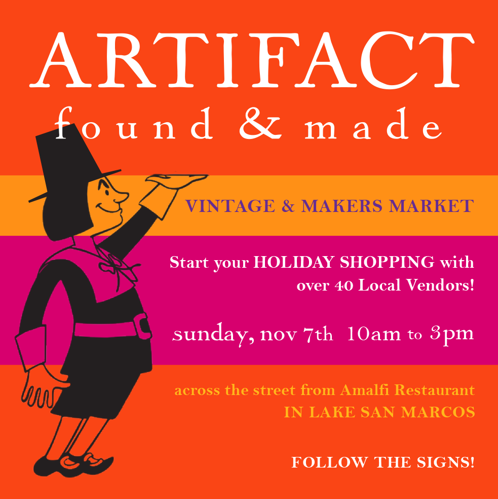 Artifact Found and Made Market Sunday, November 7, 2021 10:00 AM 3:00 PM Lake San Marcos 1035 La Bonita Drive San Marcos, CA, 92078 United States (map) Google Calendar ICS