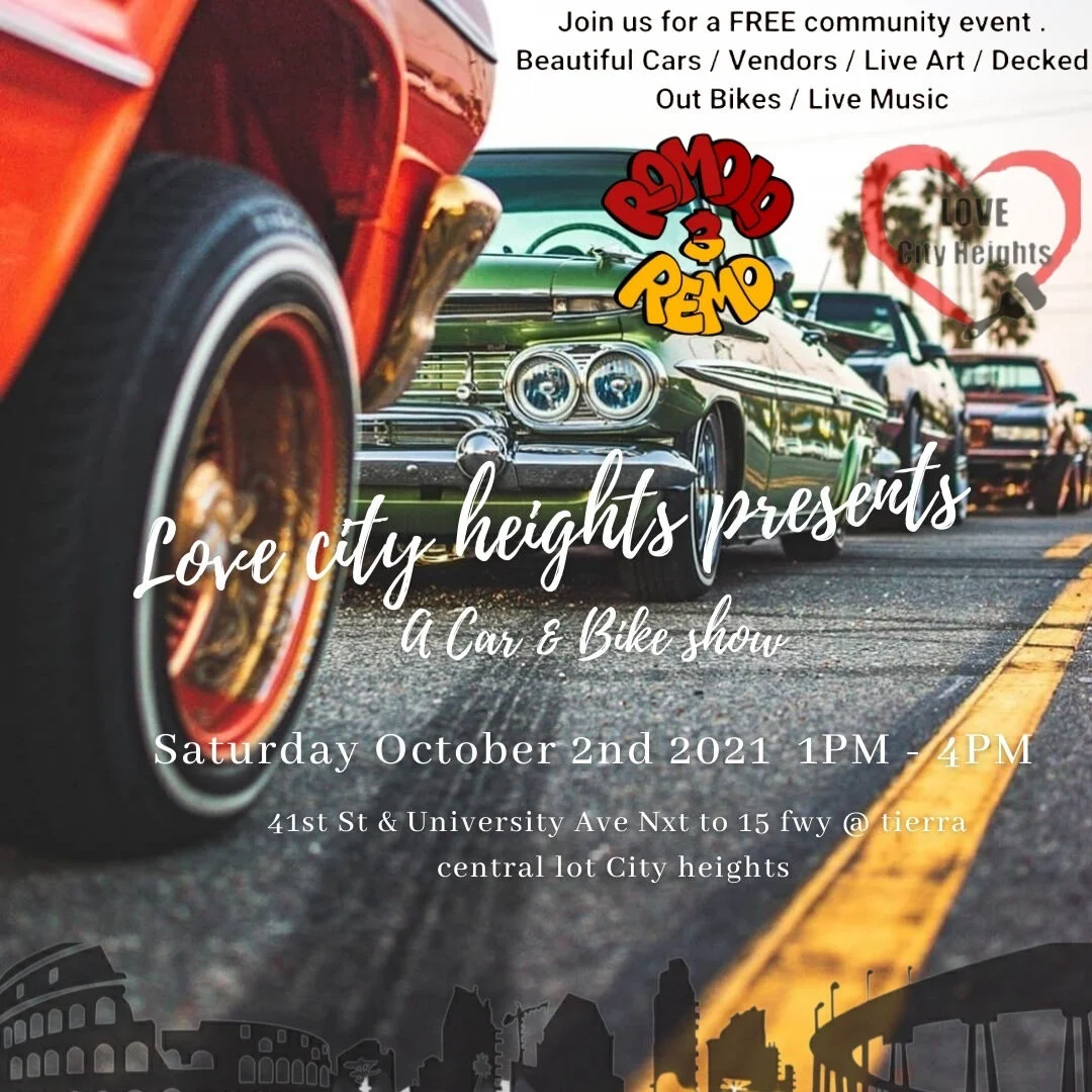 Back to All Events Love City Heights Presents: A Car & Bike Show Saturday, October 2, 2021 1:00 PM 4:00 PM 41st St. & University Ave. San Diego, CA (map) Google Calendar ICS